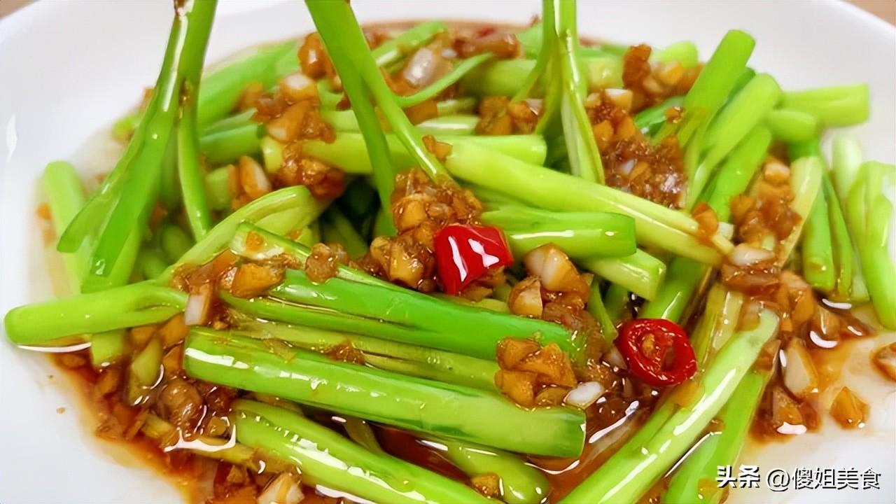 蒜薹這東西,真的是春天到初夏的寶藏食材。每年4月,正是蒜薹最鮮嫩的時候,脆生生、甜絲絲的,不像老蒜薹那樣纖維粗、嚼不動。以前總覺得蒜薹只能炒肉、炒雞蛋,沒想到涼拌之後,完全是另一種風味。保留了蒜薹最本真的脆嫩,再澆上一勺香噴噴的蒜蓉醬汁,一口下去,鮮、香、脆、爽,連喫好幾口都不膩,而且完全不上火,夏天喫再合適不過了。