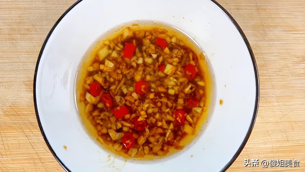 1. 把大蒜去皮,切成細細的蒜末,小米辣切成圈,一起放進碗裏。2. 鍋裏燒2勺食用油,油熱到冒煙之後,關火,把熱油澆在蒜末和小米辣上,“滋啦”一聲,蒜香瞬間就出來了,這一步是增香的關鍵,千萬別省。