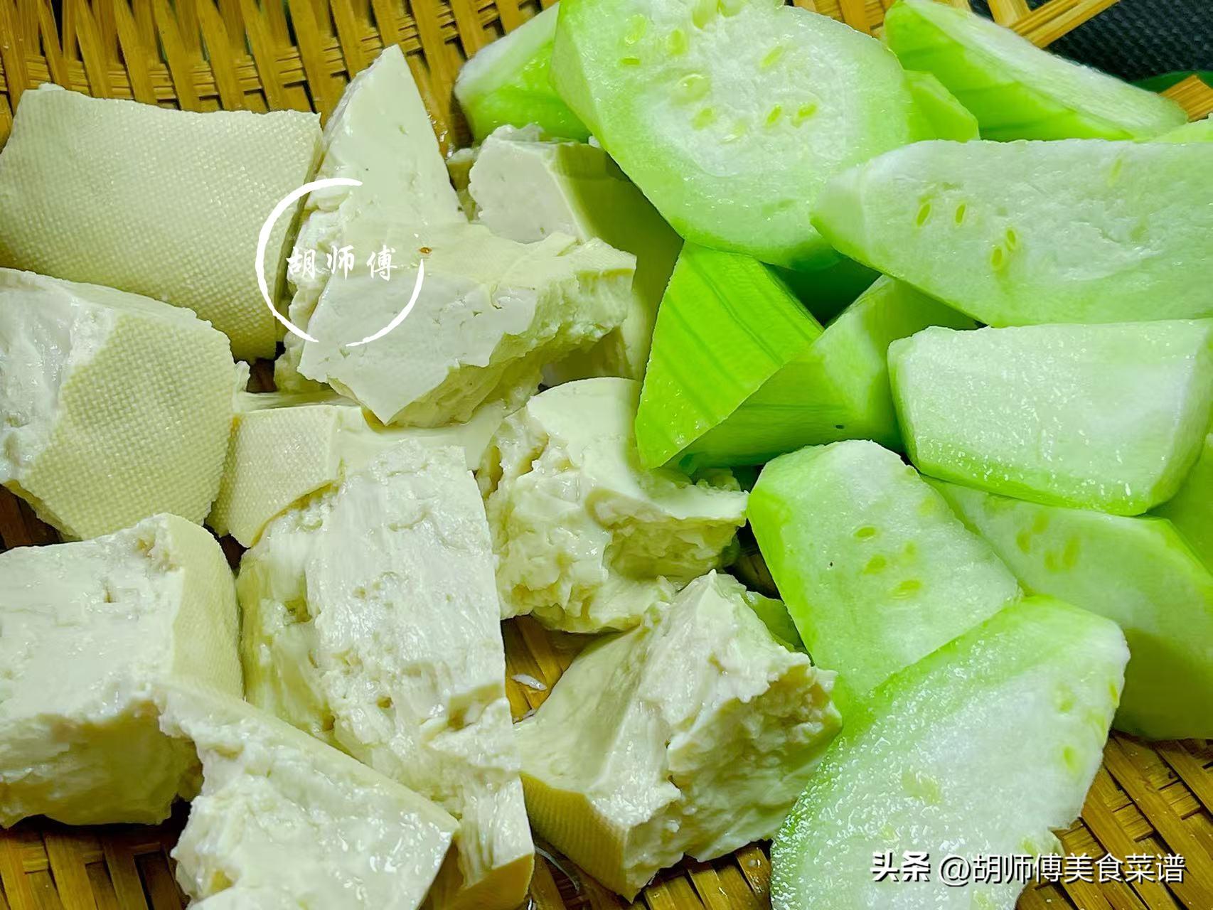 【食材準備】:老豆腐250克、絲瓜1根、香蔥10克、食鹽、清水、食用油適量。