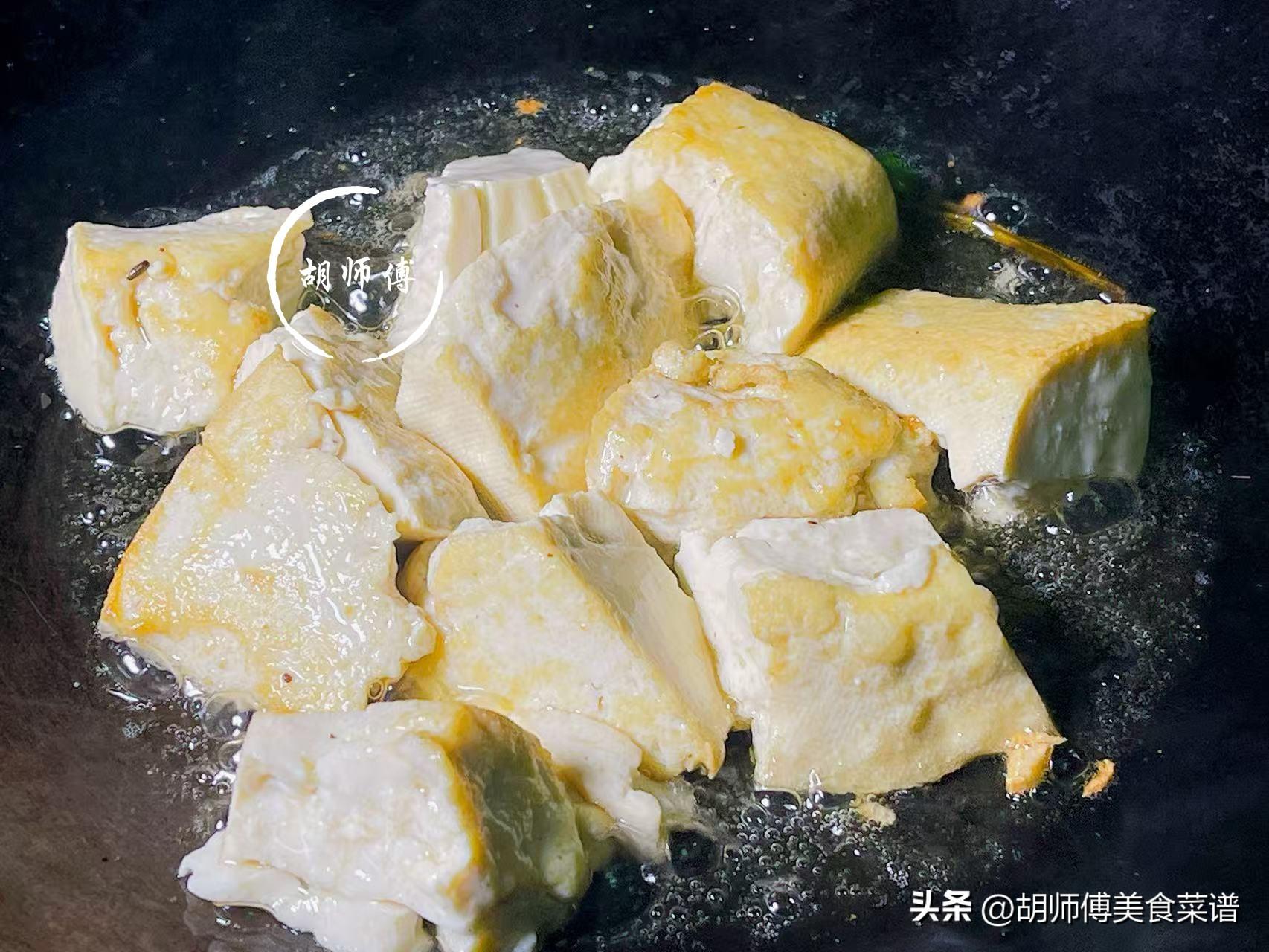 第四步:將煎好的都豆腐和適量食鹽放入鍋中翻炒幾下後,接着倒入一小碗水,蓋上鍋蓋,將它們燉2分鐘後,最後撒上一點點蔥花即可起鍋食用。