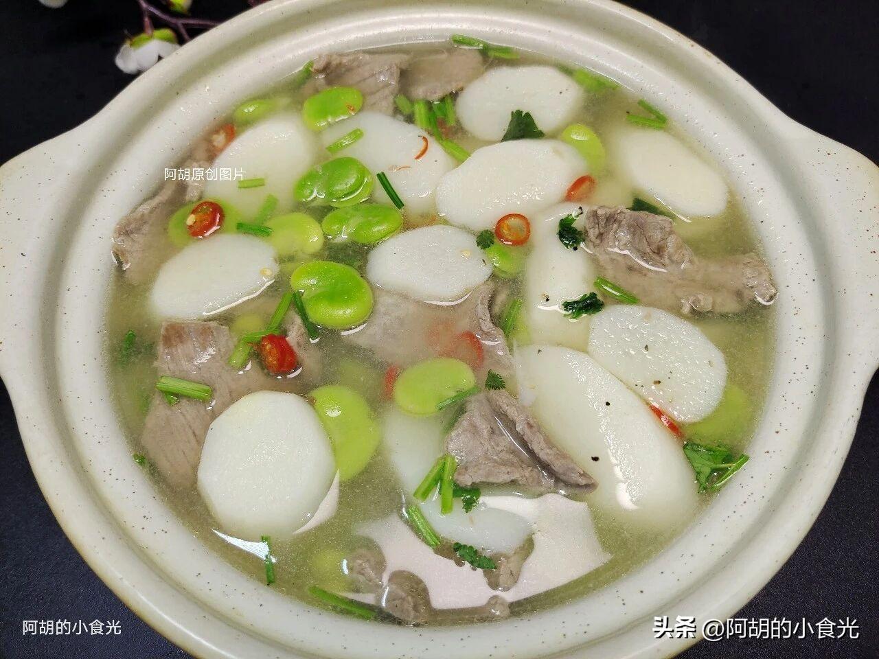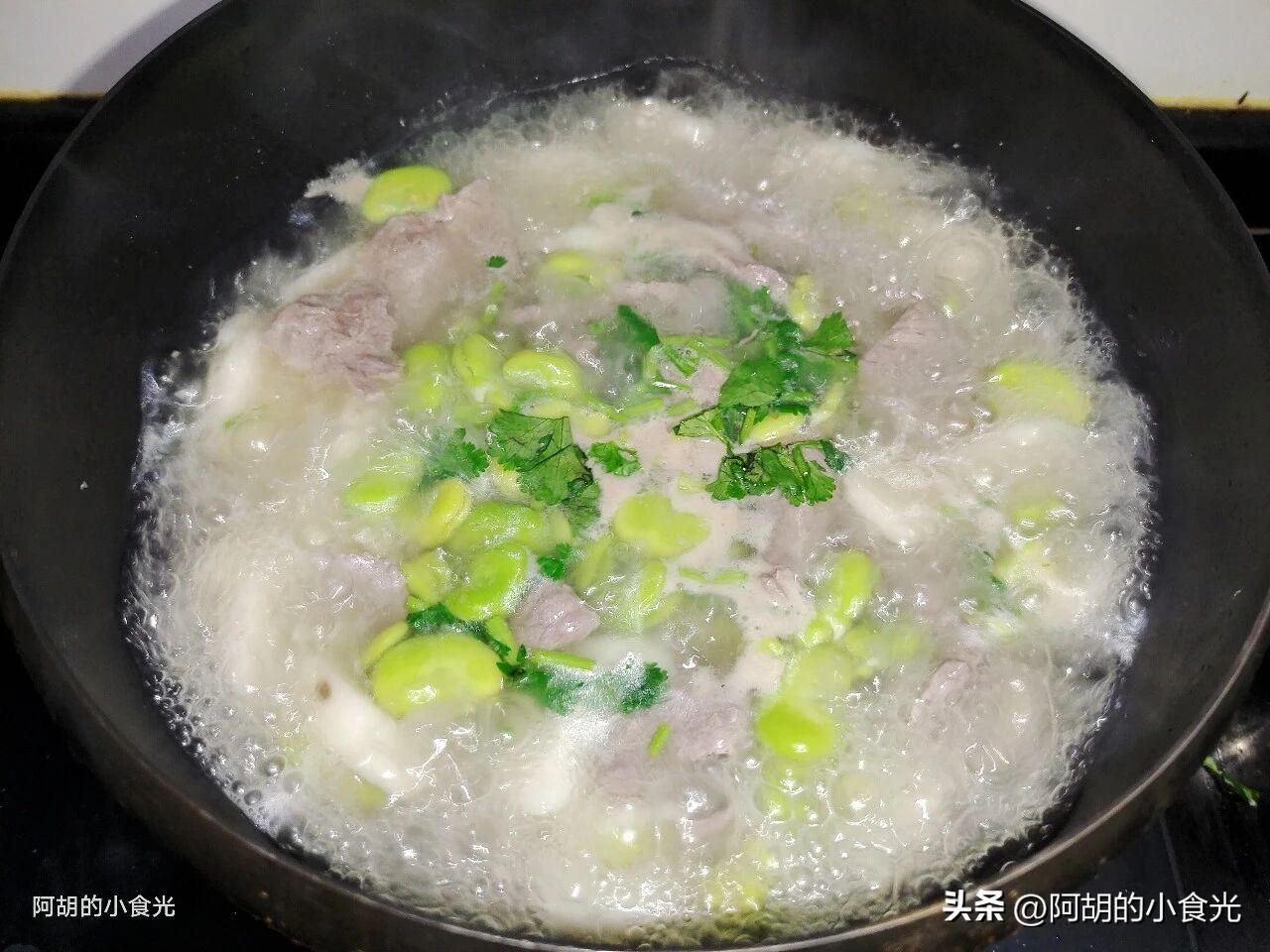 第六步:取出醃製好的牛肉片,將鍋內改爲小火或者關掉,而後加蓋肉片一片一片地下入到湯水中,待到肉片顏色全變後就開大火開始煮,將蠶豆瓣和牛肉片充分煮熟,調味就來一些食鹽、胡椒粉和少許雞精即可,最後再撒入一把蔥花和香菜碎就可以出鍋了。這碗湯最妙的就是蠶豆和山藥同時在口中化開的那種感覺,鮮香又粉糯,還有酥嫩的牛肉片,增加了鮮香味又補充了好營養。