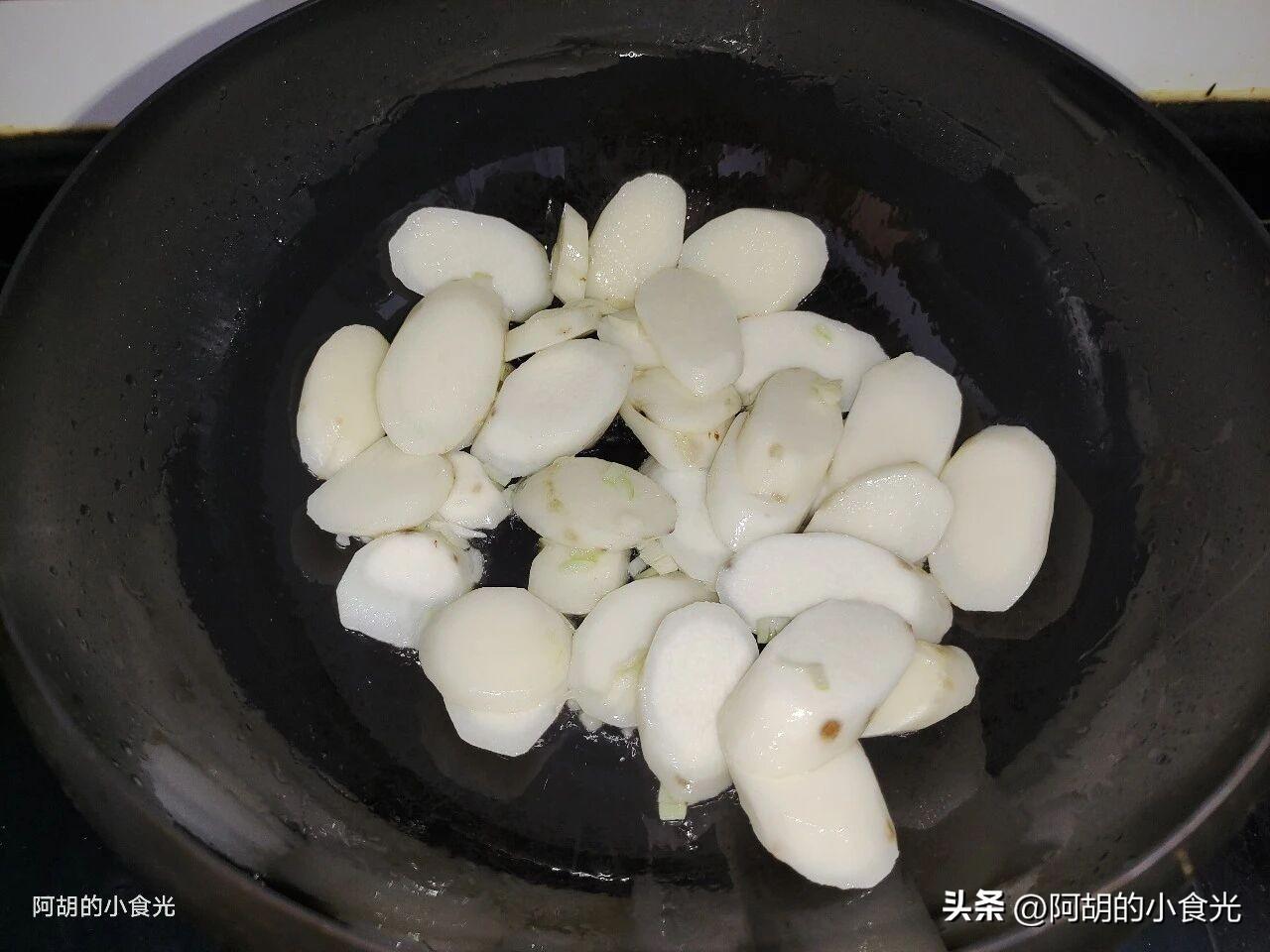 第四步:所有食材都備好後就可以開火烹飪了。鍋燒熱,淋入一些食用油,將山藥片直接倒入鍋中煎炒,炒至邊角有些微微焦黃的時候撒入一些蔥蒜末炒出香味。