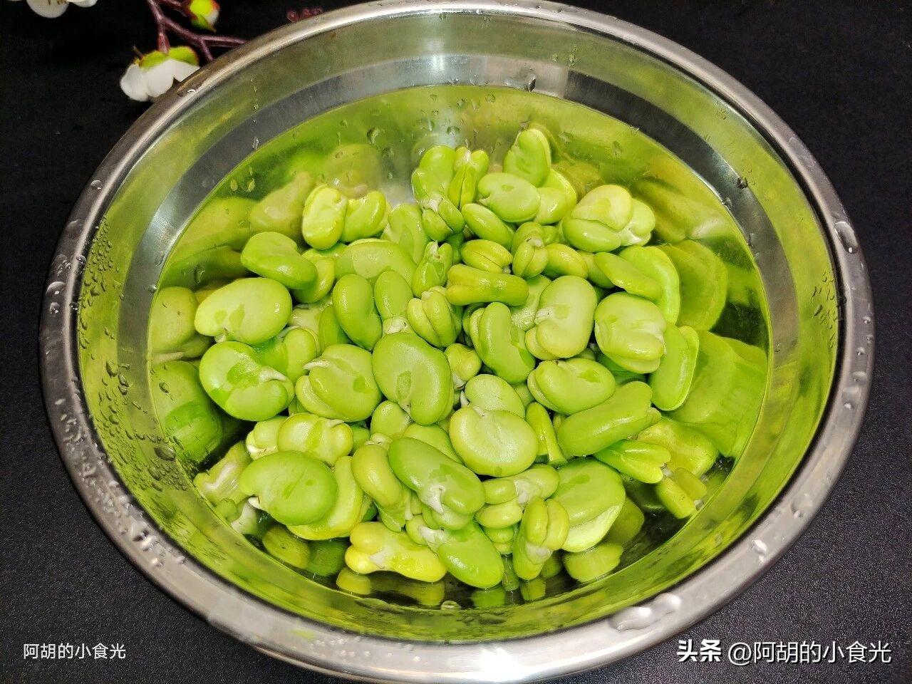 第二步:再來適量這個季節最新鮮的蠶豆,去殼後再把蠶豆仁的外皮也拔掉,這樣更有利於蠶豆鮮味的釋放。