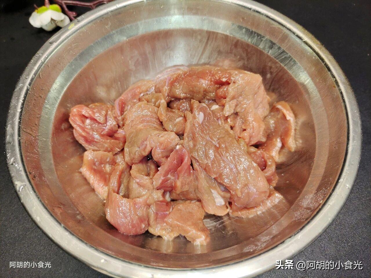 牛肉儘量挑選較爲鮮嫩的部位,因爲今天這個做法是生汆,容易讓肉質變老發柴。這裏建議使用嫩肉澱粉或者小蘇打一塊醃製,可以改善口感。
