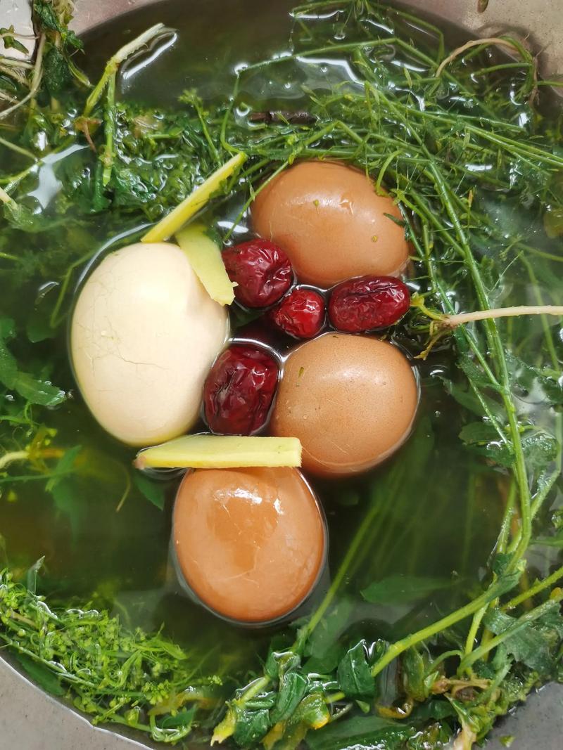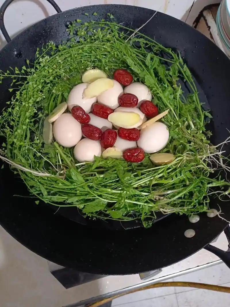 食材:帶根、帶花的薺菜 1-2把、雞蛋 6個,紅棗、生薑片