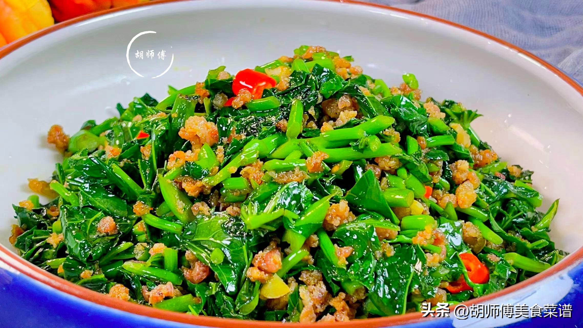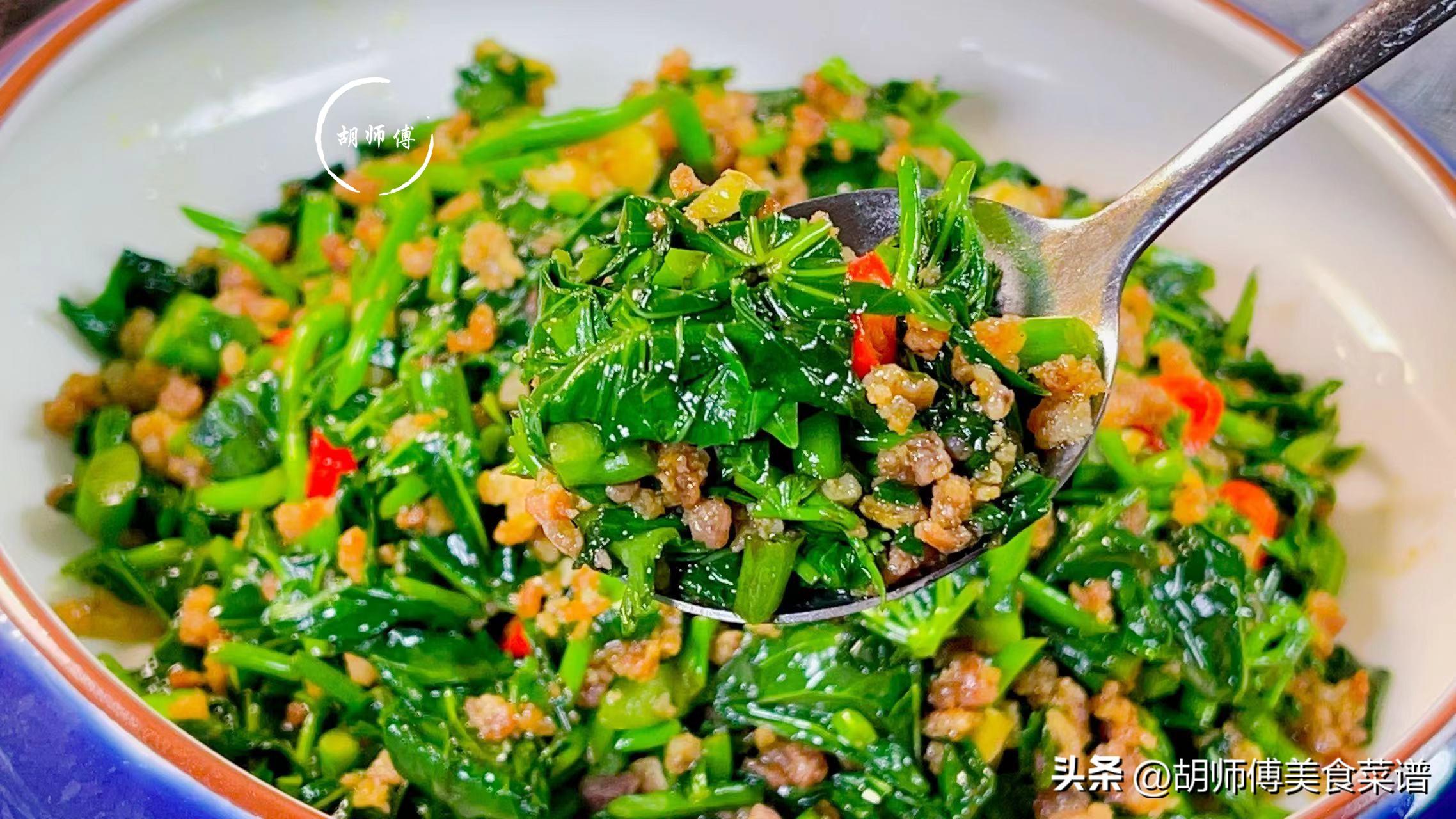 苕尖炒肉末不僅是一道下飯菜,而且還是一道非常有營養的蔬菜,每當我不知道給家人做什麼下飯菜時,我就會做這道菜,苕尖吸收肉末中的油膩,從而使這道菜喫着清爽不油膩。