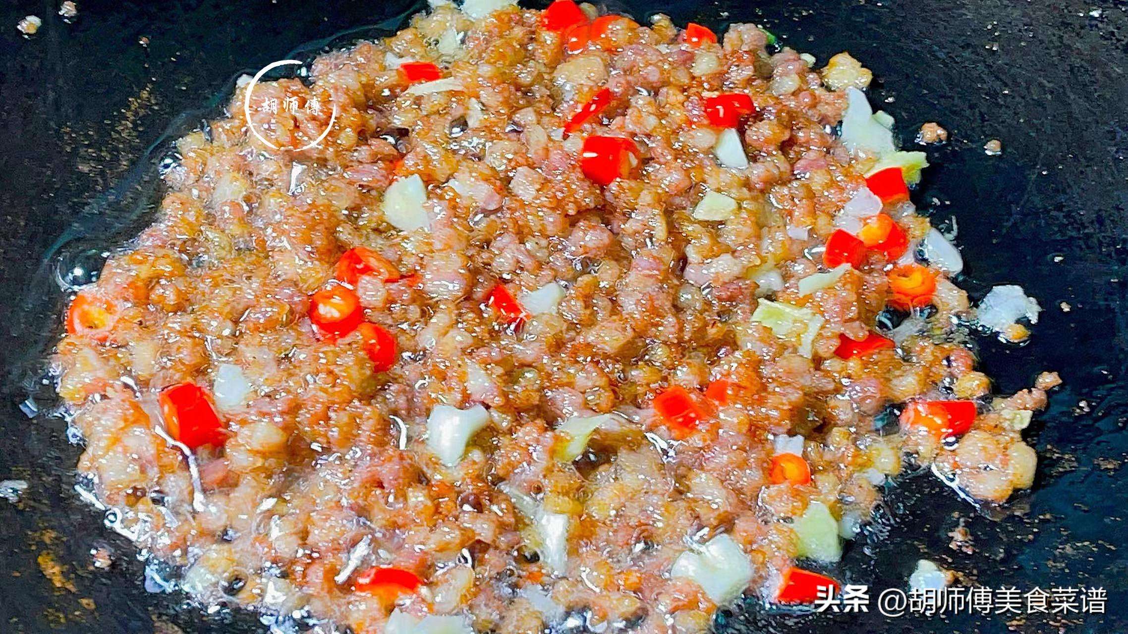 第二步:把鍋燒熱後,將油放入鍋中燒熱後,然後將肉末放入鍋中,大火將肉末炒香後,然後把蒜末、薑末、小米椒、生抽放入鍋中炒半分鐘,激發出所有調料的香味。