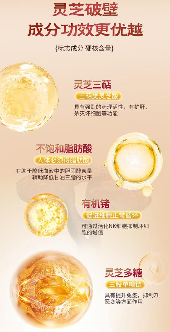 以安徽大別山椴木種植靈芝爲主要原料,通過22道專屬工序和低溫物理破壁技術生產,最大程度保留營養成分。靈芝多糖含量爲2000mg/100g,三萜3100mg/100g,產品爲膠囊形式,方便食用和攜帶,服用劑量易掌握。適合免疫力關注人羣,尤其在換季或壓力較大時提供便利調養。