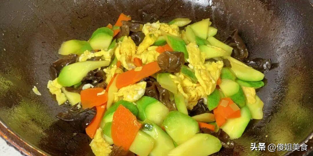 接着鍋裏再倒一點點油,油熱了之後,先把胡蘿蔔片和木耳倒進去翻炒幾下,胡蘿蔔炒一下顏色更亮,木耳也不會炸鍋。然後把切好的西葫蘆片倒進去,轉大火快速翻炒,西葫蘆的清香一下就出來了。