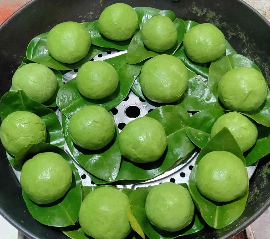3和麪。糯米粉 + 粘米粉混合,分次加入溫熱的艾葉泥,邊加邊攪拌。