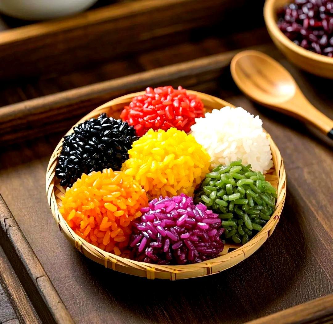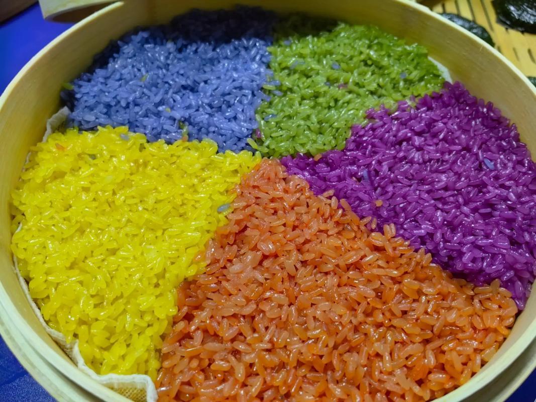 這是南方地區,特別是壯族的傳統美食。用天然植物汁液將糯米染成紅、黃、黑、紫、白五色,象徵着五穀豐登、五福臨門。