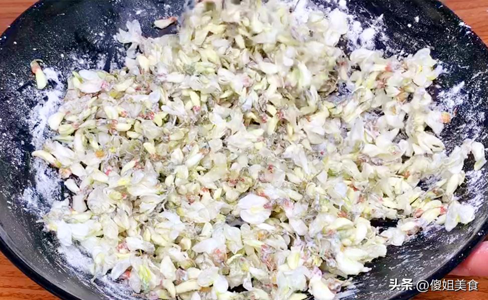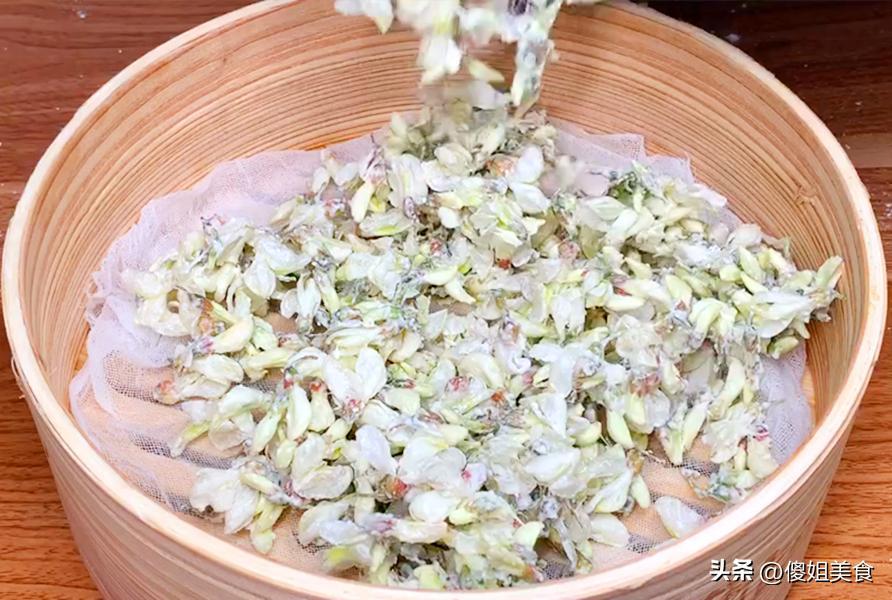 很多人蒸出來的槐花不好喫,就是麪粉加太多了,蒸出來乾巴巴的,全是面味,喫不到槐花的甜香。其實只要裹上一層薄粉,槐花之間不粘連就行,抓起來是鬆散的狀態,這樣蒸出來纔會又香又軟,不發黏。