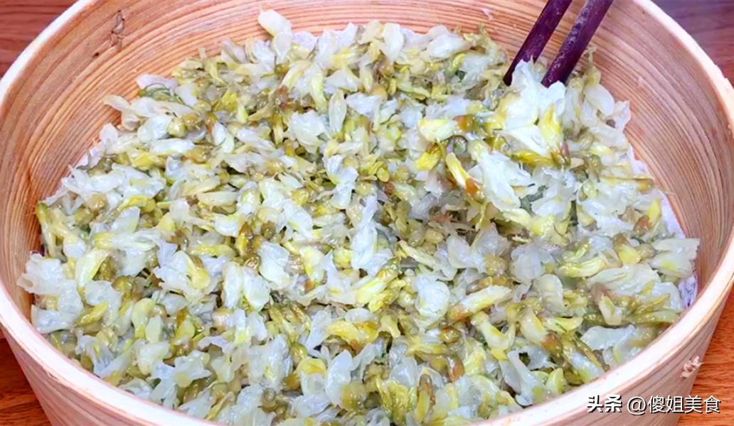 蒸好的槐花,倒進大碗裏,用筷子抖散,晾到不燙手的時候,把調好的料汁倒進去,用筷子拌勻。這時候再聞,蒜香混着槐花的甜香,直往鼻子裏鑽,連不愛喫蒜的人都忍不住要嘗一口。