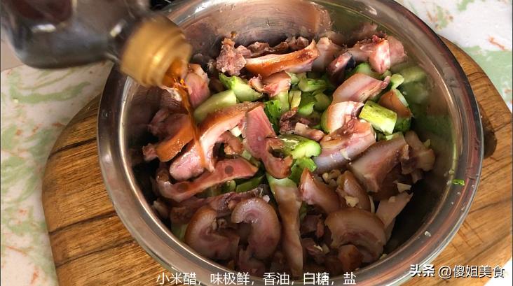 爲啥獨獨愛這一口?你別笑,這食材起來是真有講究。你說它是肉吧,又不全是肉,皮多筋多,咬起來咯吱咯吱的,特有嚼頭;說它膩吧,跟脆生生的黃瓜一拌,油星子都被黃瓜吸走了,喫着是又香又清爽,一點不齁。尤其是天熱了,就着這盤菜,我能扒拉兩碗米飯,連湯帶水的都喫得乾乾淨淨。