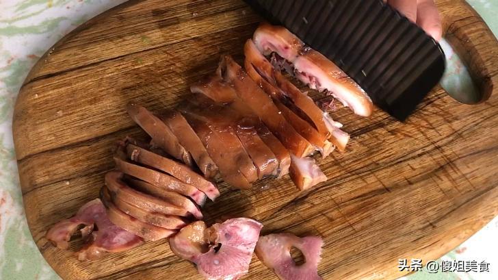切豬拱嘴,刀得快。我用的是家裏那把磨得發亮的切片刀,切的時候順着肉的紋理,儘量切得薄一點。