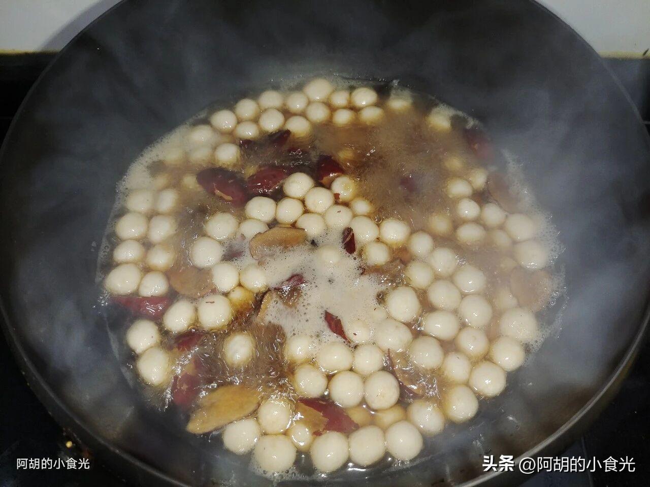 第四步:鍋裏燒一些清水,將紅棗和紅糖倒入鍋中大火煮開,而後再將糯米小湯圓也下鍋,大火煮至湯圓漂浮而起,而後再按照自己的口味加入適量的醪糟和枸杞一塊煮一煮。
