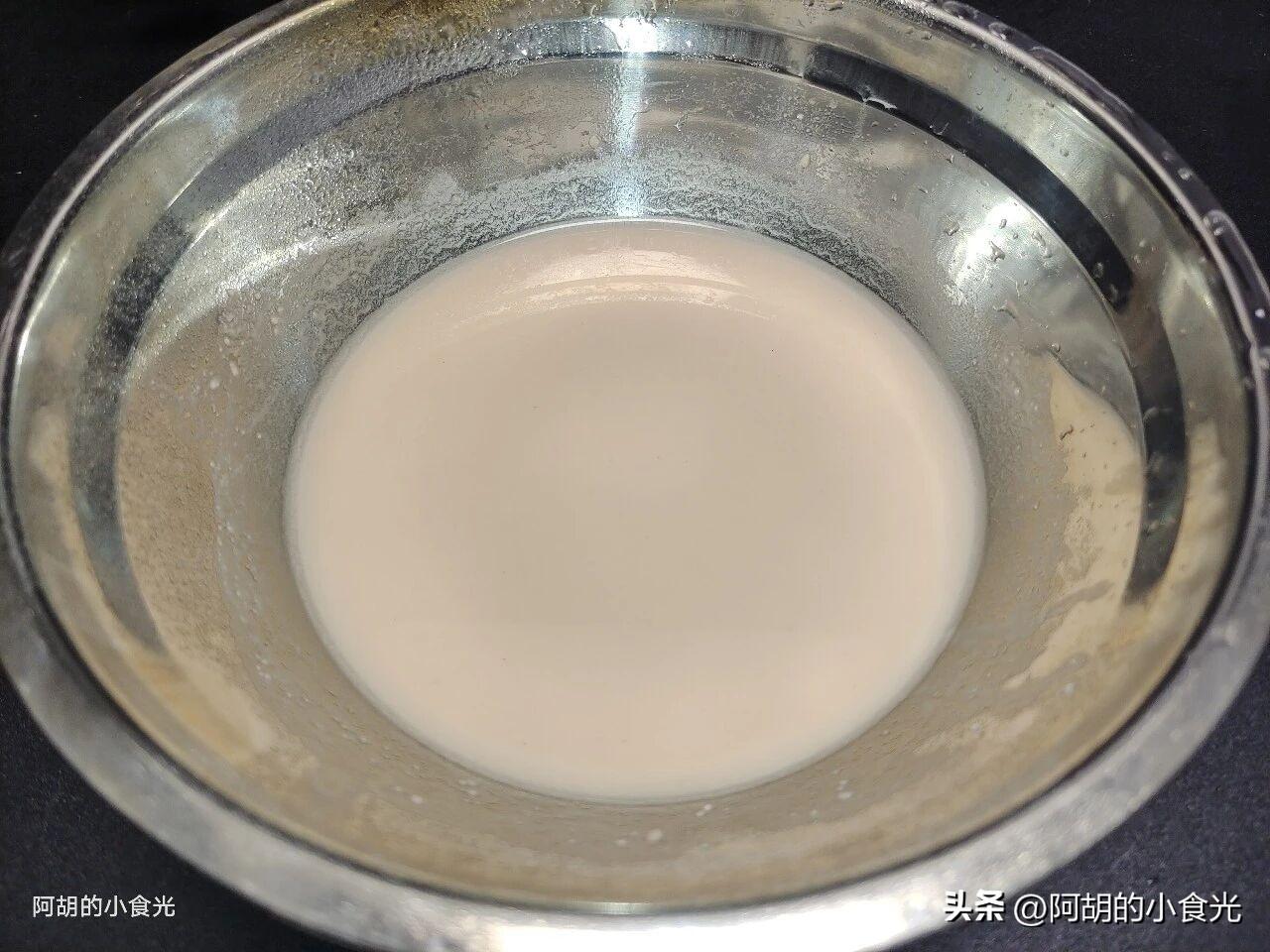 第一步:先來準備一些藕粉,這個是手削的片狀藕粉,直接兩湯匙左右倒入碗中,倒入適量的涼水充分攪拌均勻即可,很容易就化開了,要注意的是,等待期間藕粉會沉澱,下鍋之前務必要再次攪拌一下。