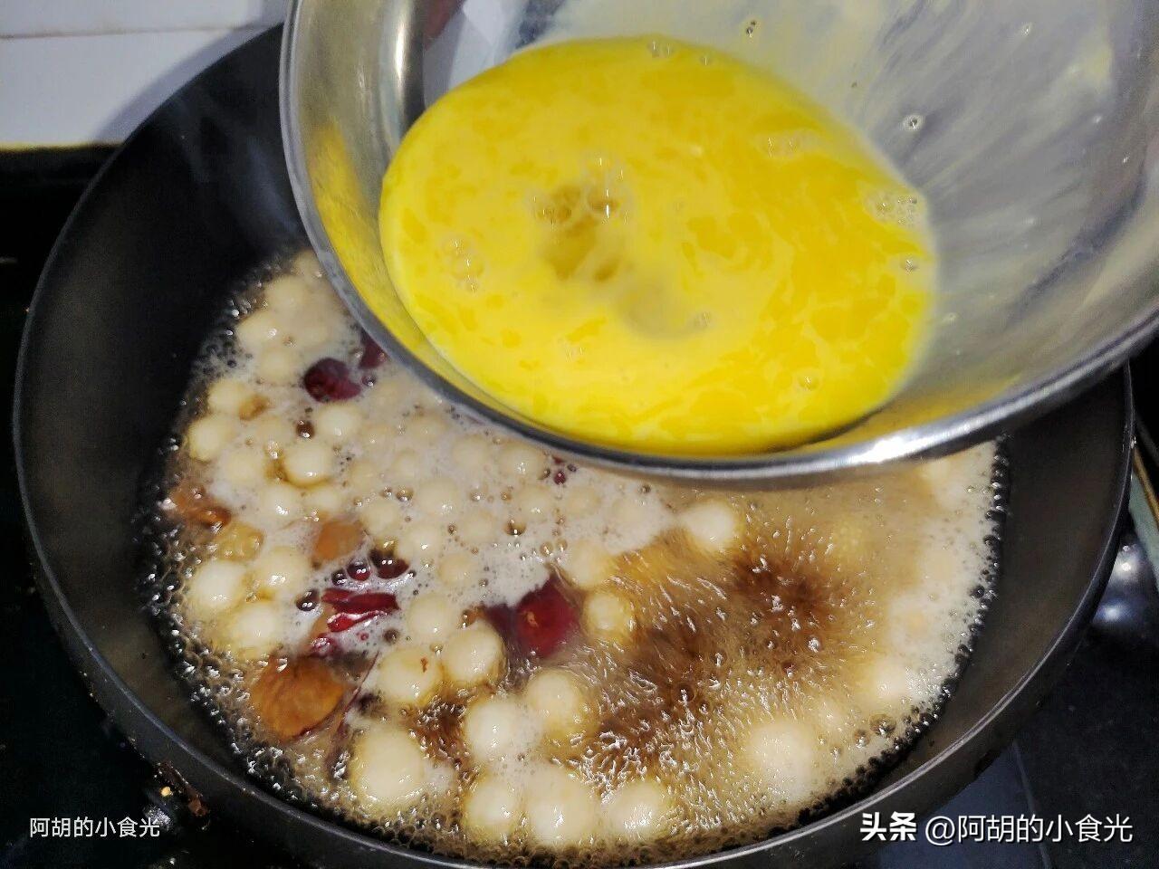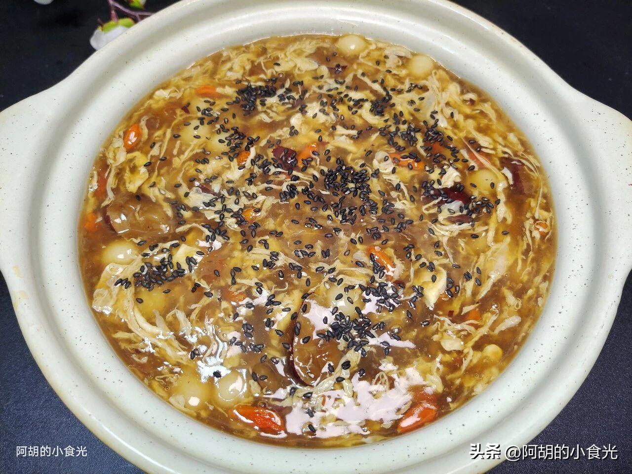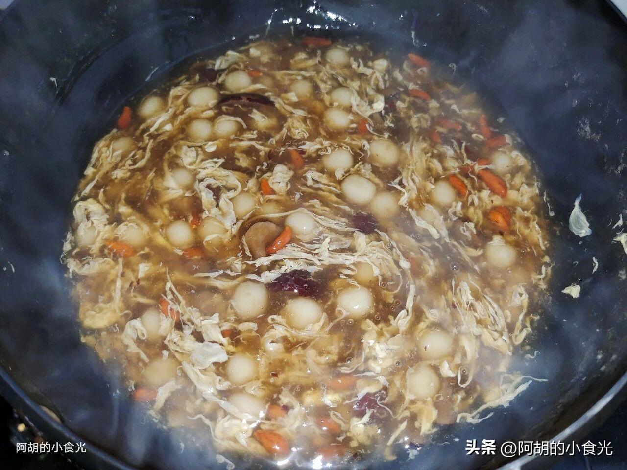 第五步:取雞蛋液淋入鍋中,攪拌一下讓其呈現蛋花狀,再取出稀釋好的藕粉液攪拌均勻,慢慢淋入鍋中,同時鍋內保持大火攪拌,讓湯水濃稠起來有拉絲的狀態即可出鍋裝盤,出鍋後再撒入一些熟的黑芝麻就可以開喫了。爽滑鮮甜一口滿足,淡淡的醪糟、紅棗香味更是惹人食慾,糯糯的小湯圓口感極好,值得試一試。