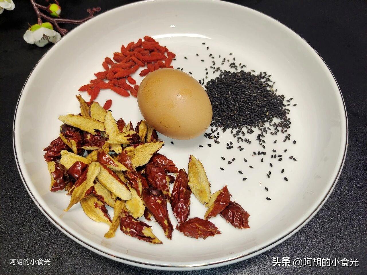 第二步:準備的其它食材有紅棗五六個左右,清洗乾淨後用剪刀剪開成小片備用,再來一小把熟的黑芝麻,用熟的白芝麻也可以,一把枸杞備用,還有兩個雞蛋磕入碗中打散後備用。