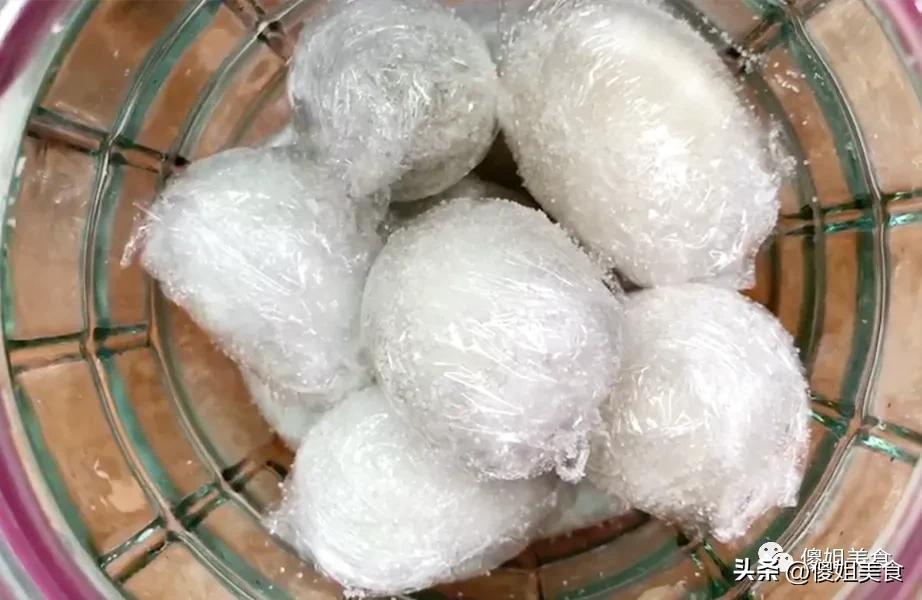 裹好鹽的鴨蛋,用保鮮膜緊緊地包起來,一定要包嚴實,別留縫隙。我媽說,這層保鮮膜就像給鴨蛋穿了件密封的小外套,既能鎖住鹽分,又能防止白酒揮發,讓鴨蛋在裏面慢慢“入味”。