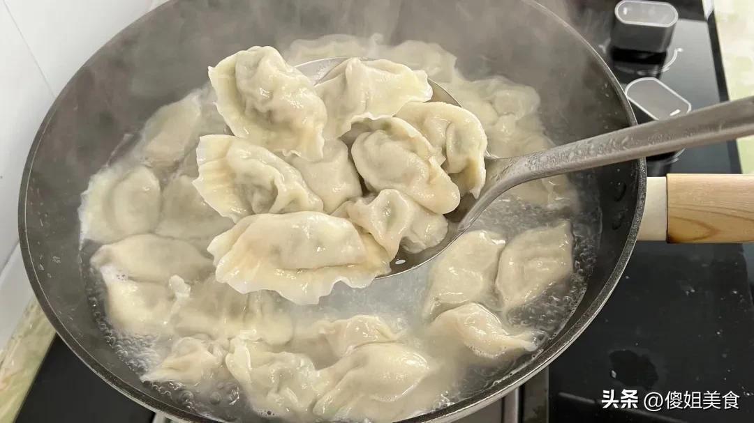 鍋裏燒開水,加一勺鹽,把餃子順着鍋邊溜進去,用勺子背面輕輕推一下,防止粘鍋。水開後,加半碗涼水,重複三次,餃子浮起來、鼓起來,就說明熟了。你看我這鍋裏的餃子,一個個都圓鼓鼓的,撈出來的時候,還冒着熱氣呢。