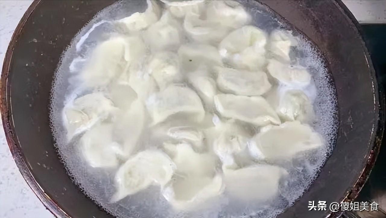 第五步:鍋裏燒開水,把餃子一個個滑進去,用勺子背輕輕推一下,防止粘鍋底。等水開了,就加半碗涼水,反覆加三次,餃子就熟了。
