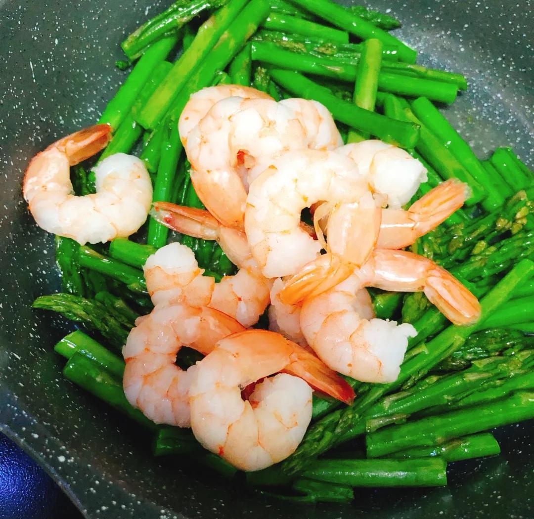5鍋中留底油,放入姜蒜爆香。倒入瀝乾水分的蘆筍,大火快速翻炒幾下。接着將剛纔炒好的蝦仁倒回鍋中,加入適量鹽調味(口味重的可以加少許蠔油),快速翻炒均勻即可出鍋。