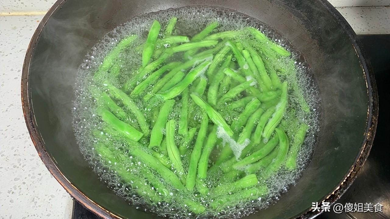 第二步:鍋裏燒水,水開之後,往鍋裏滴幾滴食用油,再撒上一小撮鹽,倒入四季豆,用勺子輕輕推兩下,焯水的時間不用太長,大概2-3分鐘就行,看到四季豆顏色變得鮮亮翠綠,就可以撈出來了。