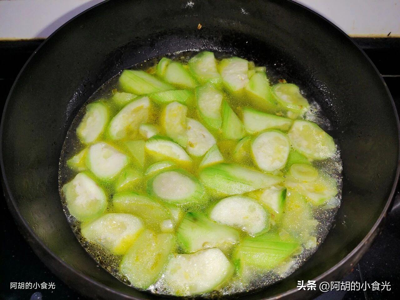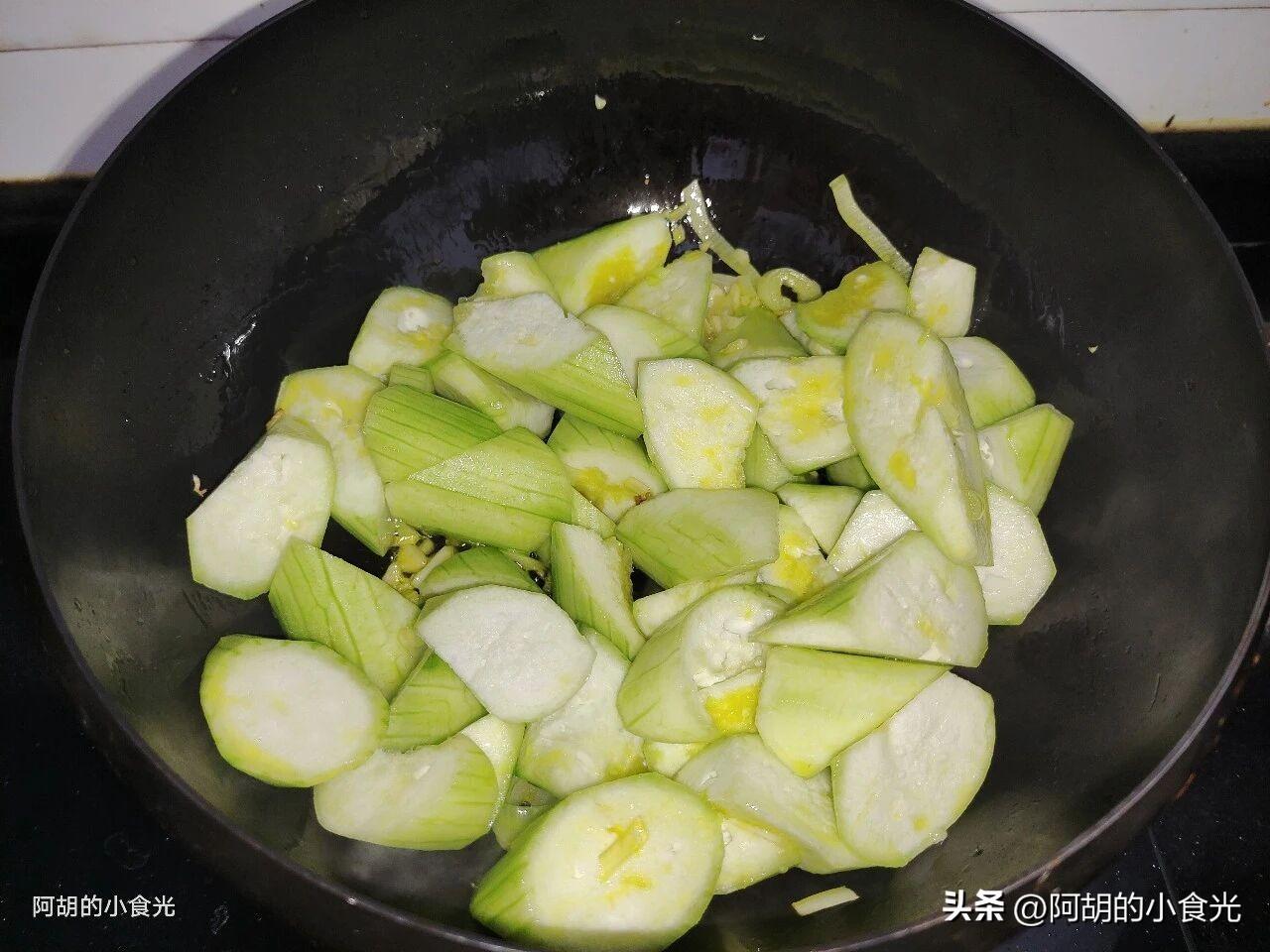 第三步:所有食材都備好後就可以開火烹飪。炒鍋裏添入適量的菜籽油燒熱,把蔥蒜下鍋炒出香味,接着把絲瓜塊倒入鍋中,轉爲大火快速翻炒30秒鐘左右,再淋入一些高湯,沒有高湯的就直接用開水即可。