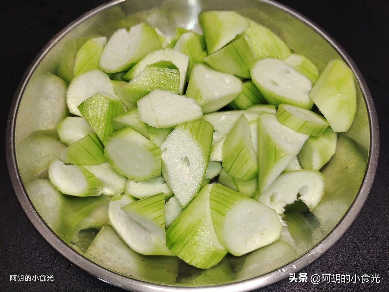 第一步:今天的主要食材就是絲瓜,直接削去外皮後切成滾刀塊,因爲後面需要等待一些時間,這裏建議把絲瓜塊放入涼水中浸泡,並淋入少許的白醋攪拌均勻,這樣可以防止絲瓜和空氣接觸時間太久而氧化變色。
