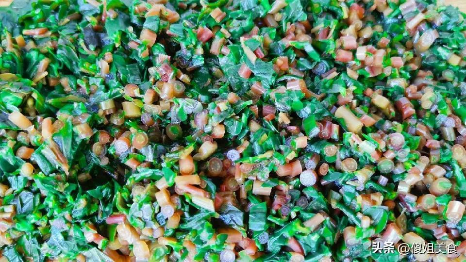 3. 擠幹切碎:把焯好水的馬齒莧,攥幹多餘的水分,然後用刀切成碎末,切得越碎越好,這樣攤餅的時候不容易散,喫起來口感也更細膩。