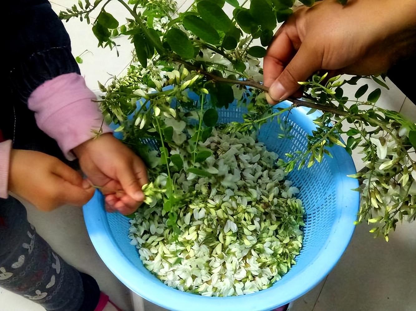 做法:1處理槐花,槐花摘去硬梗,用清水多淘洗幾遍,瀝乾。