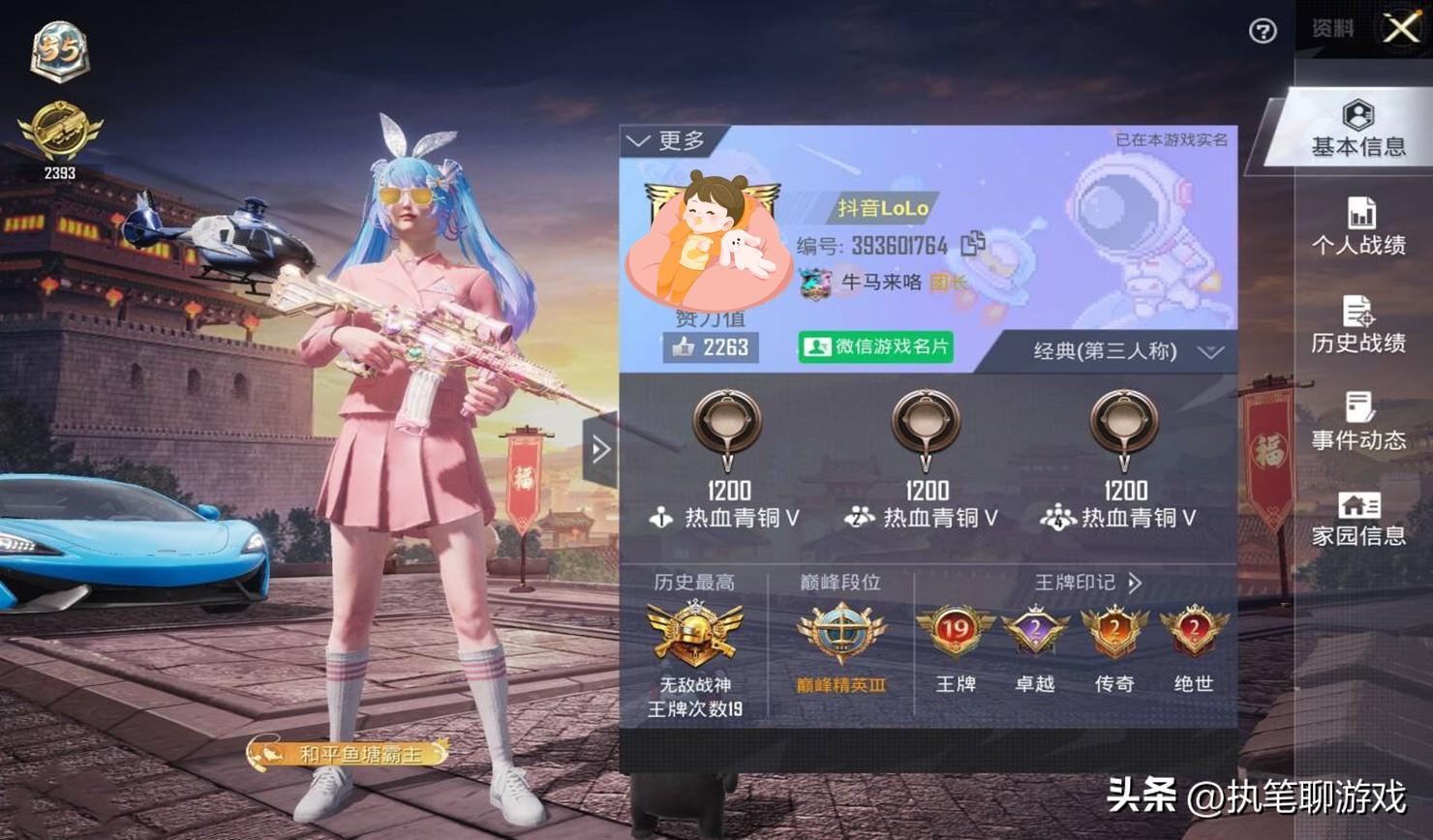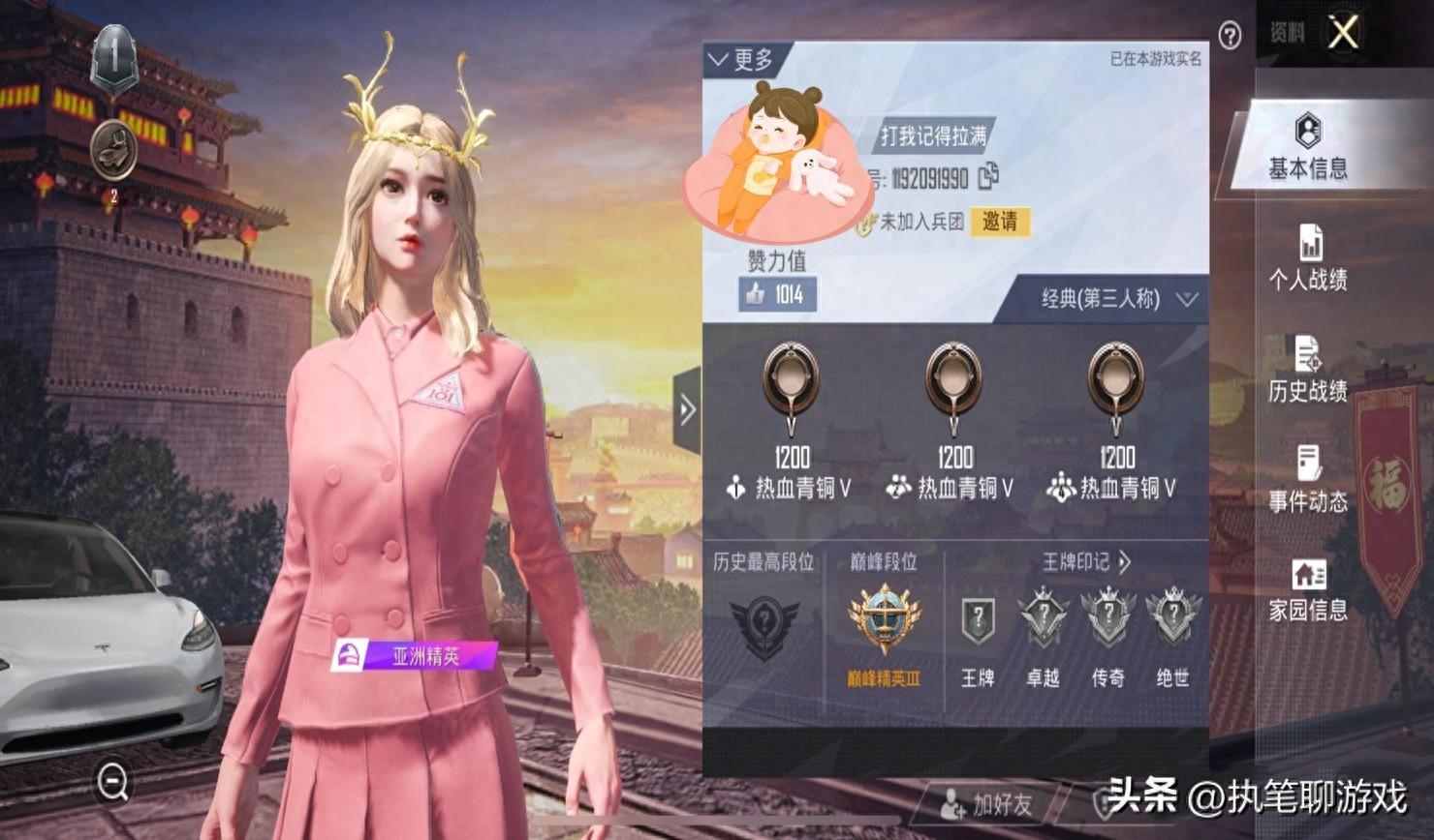 這位身穿舊版少女101,背後停着銀色特斯拉的玩家,已經變成了1200分的熱血青銅。
