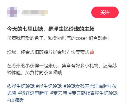 12月31日,《浮生憶玲瓏》在蘇州山塘街開啓了玲瓏女孩江南跨年citywalk活動。除了設置衆多打卡點、爲遊客提供集章獎勵以外,遊戲官方還爲這場跨年盛會準備了不少表演,包括跨年玲瓏燈亮燈儀式、玲瓏踏舞舞蹈快閃等。citywalk、快閃、打卡等現代娛樂形式,也給江南古風增添了幾分時尚和樂趣。