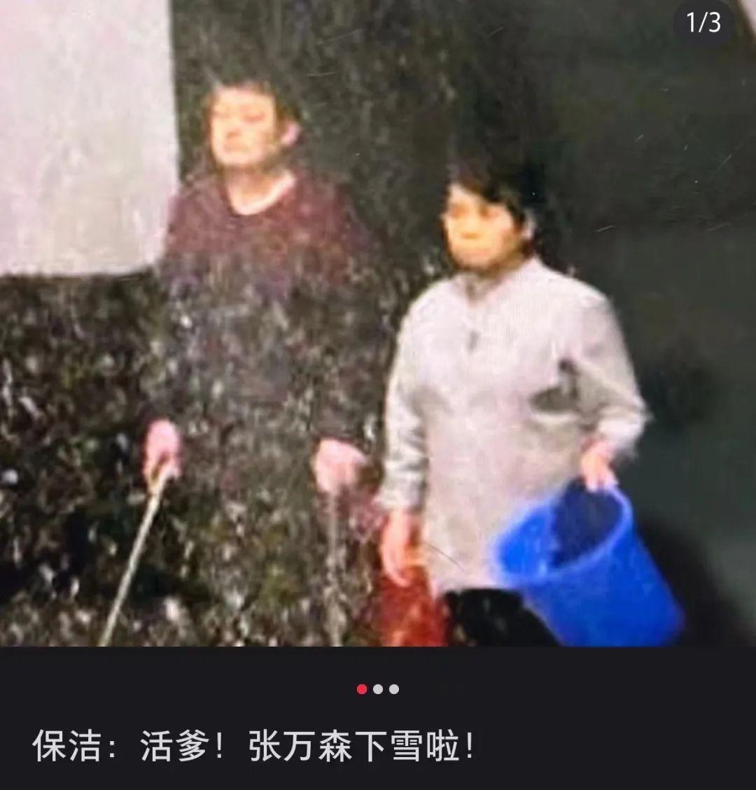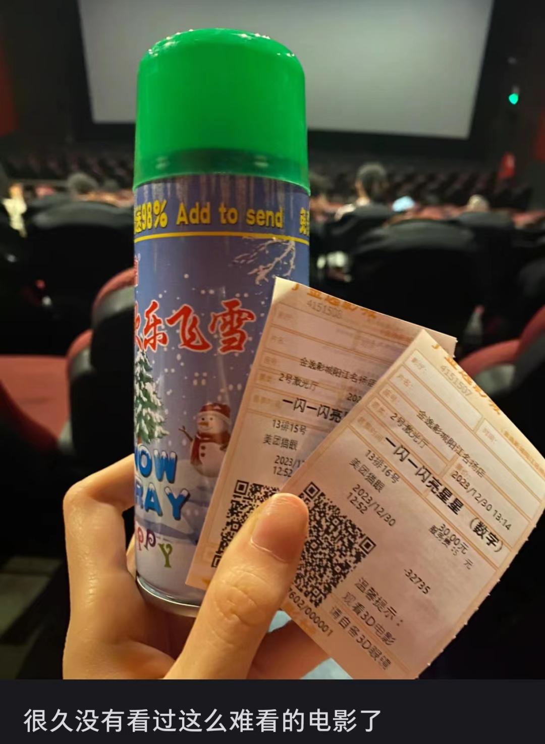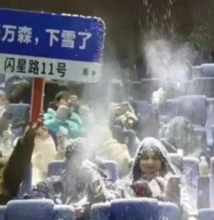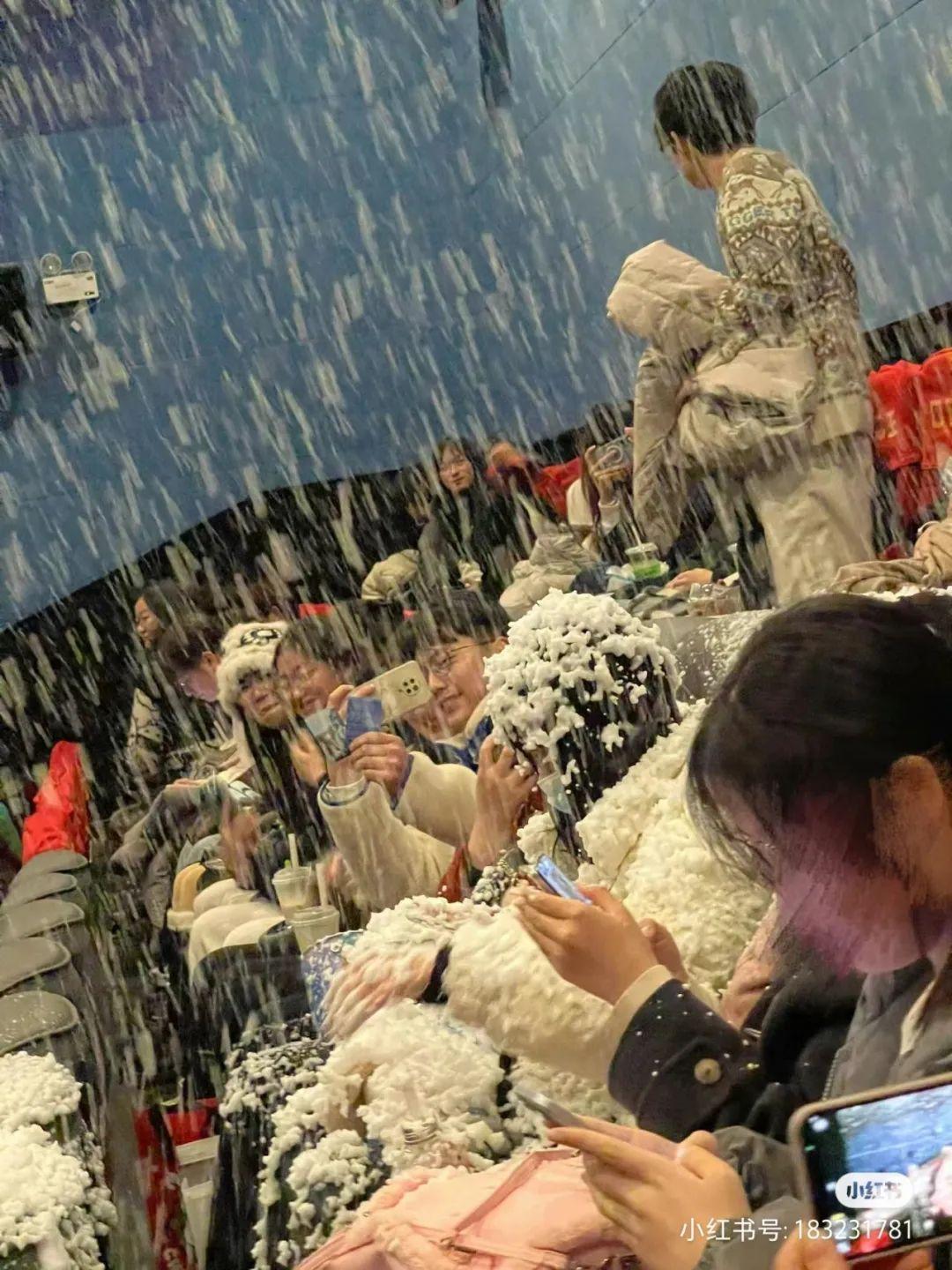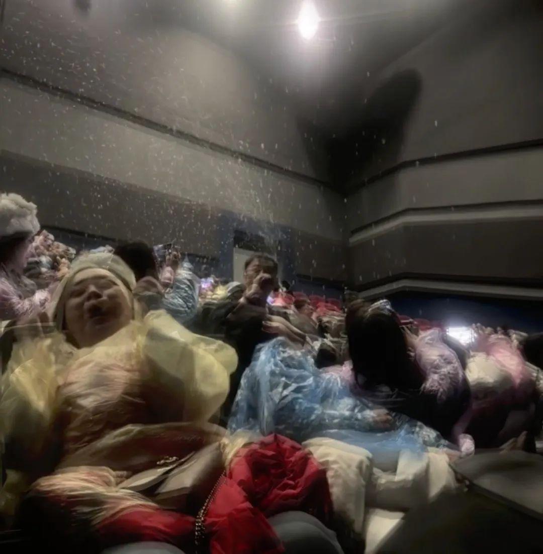 放映結束,前來觀影的羣衆們戴着滿頭的雪花,一邊COS着“旺旺雪餅”,一邊心滿意足地離場;留下匆匆趕來的保潔阿姨傻眼了,在這行幹了三十年,還是頭一回遇到室內暴雪,也不知道這掃帚和抹布能不能擦去電影院坐席上厚厚一層積雪。