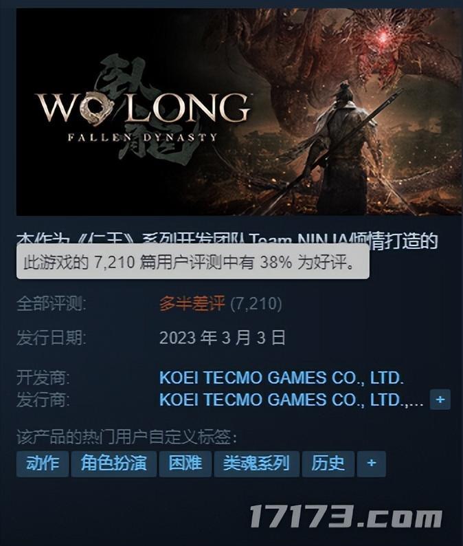 雖然《臥龍:蒼天隕落》的賣相很不錯,還沒開賣就獲得了“日本遊戲大獎2022”未來獎,後來還獲得了衆多國外媒體給出均分83的高分,其中27家媒體都給了遊戲好評。但是光榮做遊戲不重視PC端的老毛病依舊,因爲優化問題遊戲在steam口碑崩塌,當時遊戲的評分一度跌倒“多半差評”,好評率僅38%。