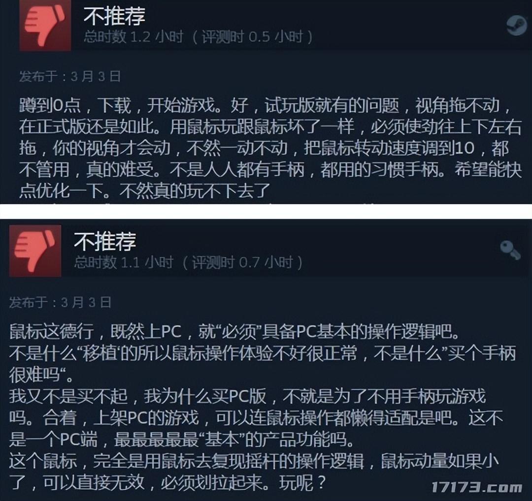 衆多問題中最嚴重的就是超遲緩的鏡頭轉動,有玩家表示感覺像是鼠標壞了一樣,要非誇張的移動鼠標才能轉動鏡頭。有老玩家猜測之所以會這樣,是光榮把手柄的操作邏輯套用在鼠標上,可以說沒有手柄的不配玩這遊戲。