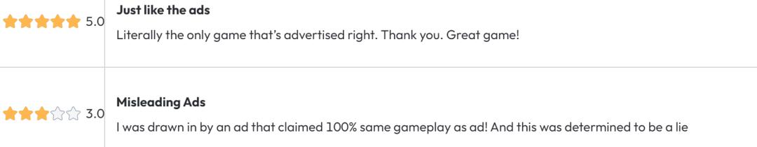 這自然也就能引出下一個問題,玩家到底喫這一套嗎?誠然,從此前一些案例的成績來看,市場當然有過一些積極的響應。而具體的感受則因人而異,前段時間我們跟進《Last War》的時候就注意到,確實有玩家覺得,遊戲體現了廣告裏的玩法,並在應用商店留言予以肯定。但也不乏用戶依然覺得,這種內容呈現是誤導性的。