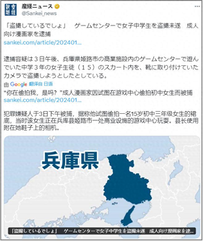 一則抽象新聞:一位名叫小路將司的日本成人漫畫家,在遊戲廳試圖偷拍15歲國三女生的裙底被捕。