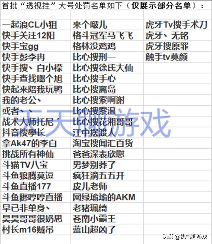 如圖所示,這是光子官宣的首批“透視掛”大號處罰名單,是不是覺得裏面有好多熟人呢?嘿,將近一多半都是遊戲主播,其中還不乏一些知名的無敵戰神們,這也是爲什麼後來的《和平精英》裏,有了“十個主播九個掛”的說法。