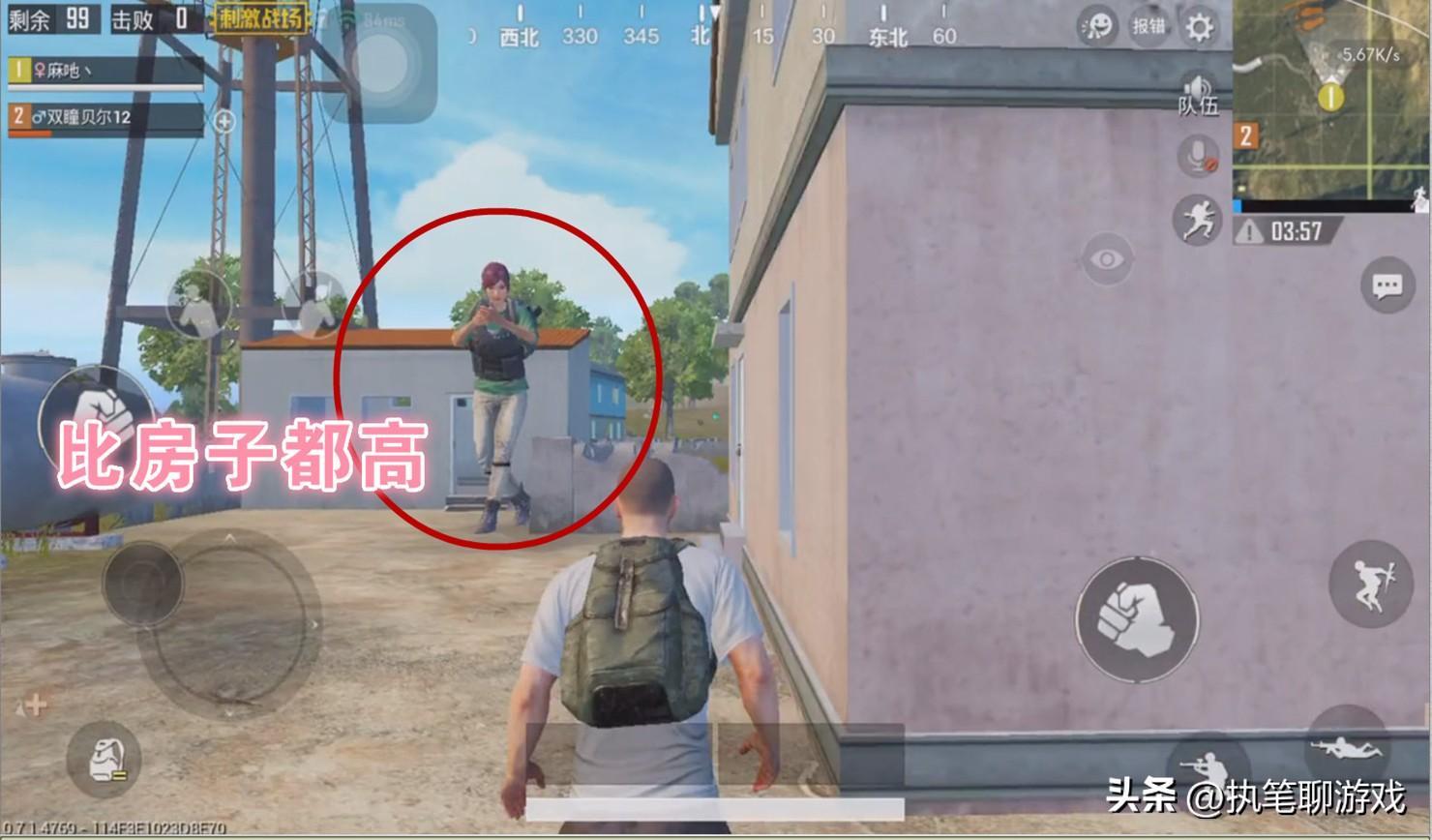 遊戲角色可以變身成巨人,也可以變成“上手怪”或者“長腳怪”,遊戲角色站在地面上,比三層小樓還要高手臂舉着AKM,淘汰三樓陽臺的玩家,還真不是什麼稀罕事兒。