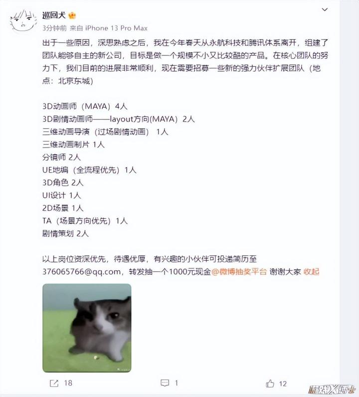 ↑↑《白夜極光》藝術總監“巡迴犬”發微博表示離開騰訊體系