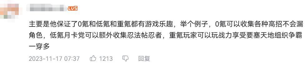 這與我先前在網上刷到的《火影忍者》手遊玩家評論,基本一致,總結起來就是:內容品質有保障,且0氪、微氪、重氪都能享受格鬥競技樂趣。