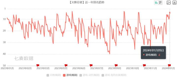 其次,在流水層面,《火影忍者》手遊的暢銷榜數據,也在一定程度上代表了玩家的實際支持。