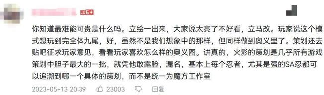 讓玩家覺得“難能可貴”的一點是,《火影忍者》手遊策劃並不是自顧自地做設計,而是會通過策劃說、貼吧等途徑,和玩家溝通意見。玩家提的那些想法,只要不會對遊戲平衡性造成太大影響,基本最終會被落實進遊戲裏。