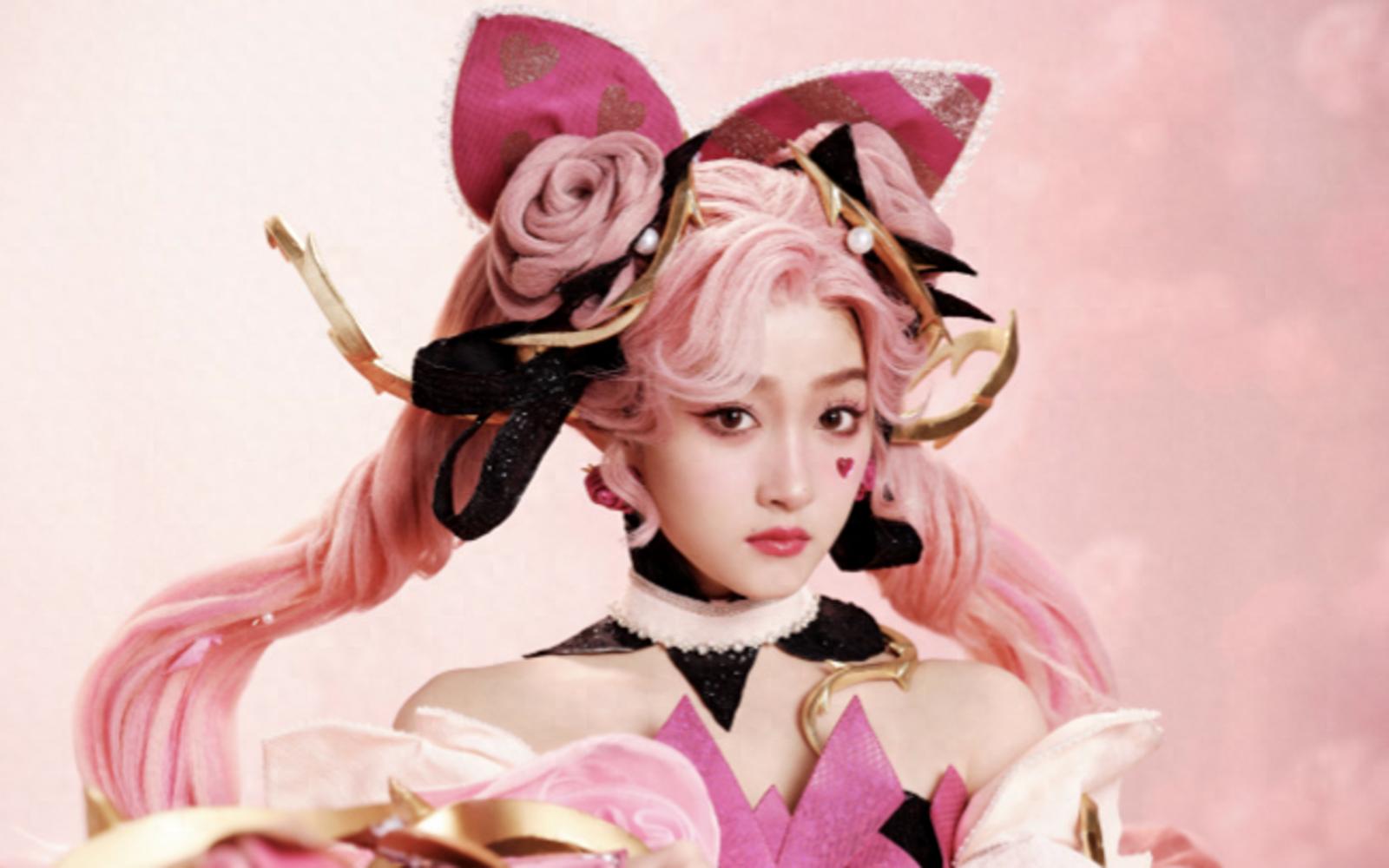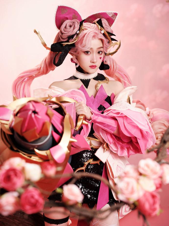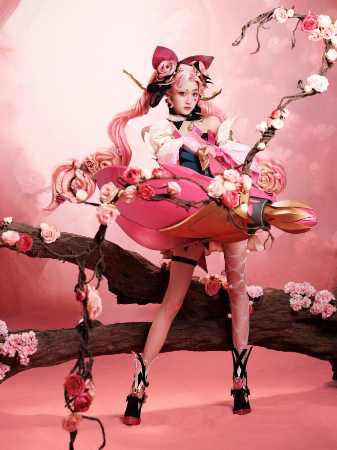 而這一番投入換來的,自然是六位明星cos的高還原度。關曉彤cos了孫尚香的“薔薇戀人”皮膚,巨大的假髮在整體造型裏很是搶眼,形象設計上甚至還原了漁網襪這樣的細節: