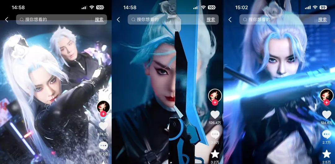 戚薇、李承鉉cos皮膚“默契交鋒”造型的短視頻,在抖音上獲得了660多萬的點贊,另外兩條短視頻點贊量也都超過了百萬,有網友稱其“復刻程度99.99%”;