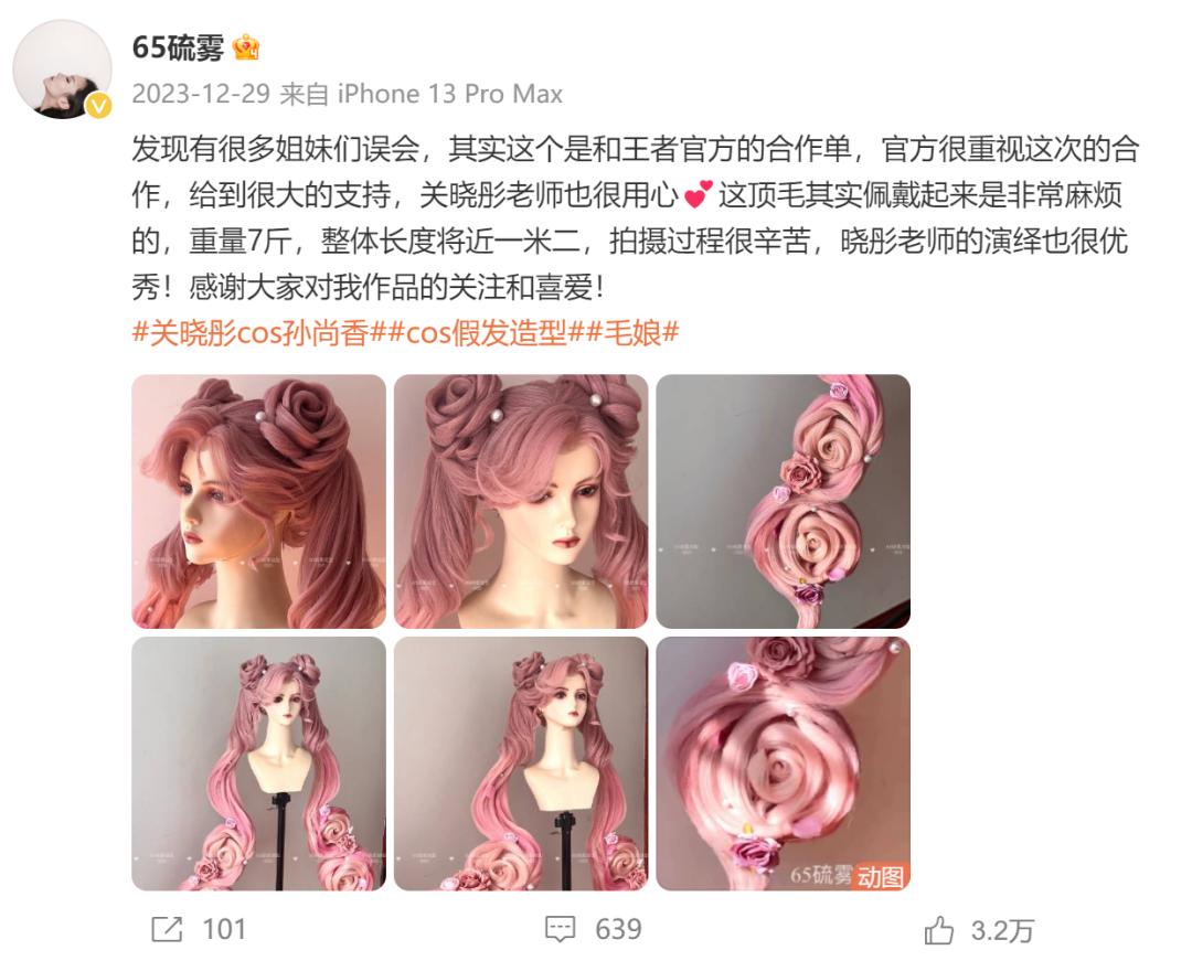 負責關曉彤cos道具假髮的“毛娘”曬出了自己的設計,展示了不少鏡頭之外這頂長一米二、重七斤的假髮的製作細節,她肯定了官方的重視以及關曉彤的敬業。“反重力假髮”相關的標籤也登上了小紅書熱榜和微博熱搜。