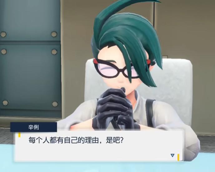 昏暗的小房間、皮手套、黑框、壓抑的背景音樂、金屬書桌與大門,與寶可夢IP一向的軟綿綿暖色系色調不同,整個畫面都是與其髮色匹配的灰青色調,甚至連辛俐的口音都變成了標準語,更突出辛俐的”冷“。