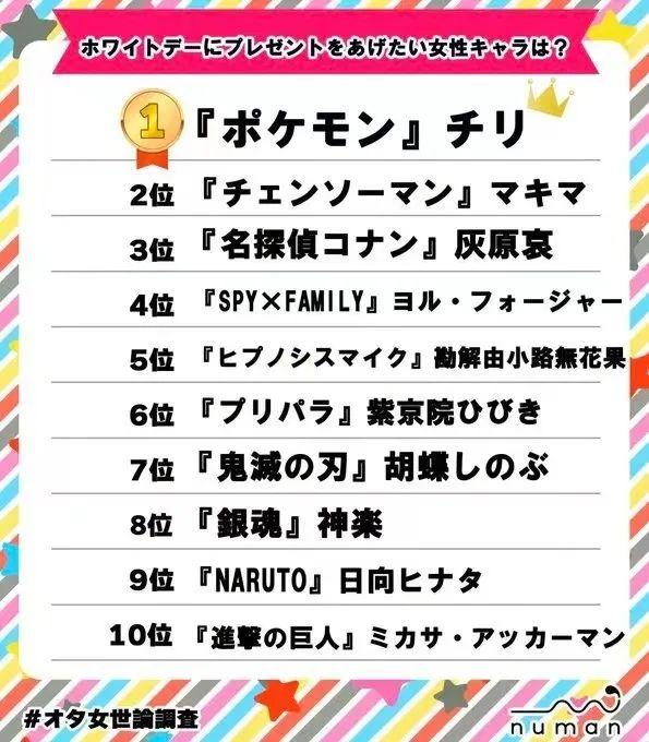 但更有趣的是,她的名字同時也出現在了“白色情人節最想給她回禮的女性角色TOP10”中,日本同樣有着白色情人節男生向女孩回禮的習慣,於是這一次,“夢男”們直接給辛俐投到了第一名。
